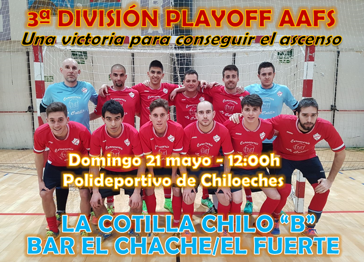 La Cotilla se medirá al Bar El Chache/El Fuerte, equipo que no se juega nada ya que tras pleno de victorias consiguió el ascenso en la jornada cuatro del playoff. Los otros dos rivales por el ascenso, Fontanar y Azuqueca, ambos con opciones, pero necesitan que los nuestros no sumen los 3 puntos. De esta forma La Cotilla Chilo necesita el apoyo de todos para el último partido de la temporada, que sería un broche de oro a una espectacular temporada. OS ESPERAMOS!!!
